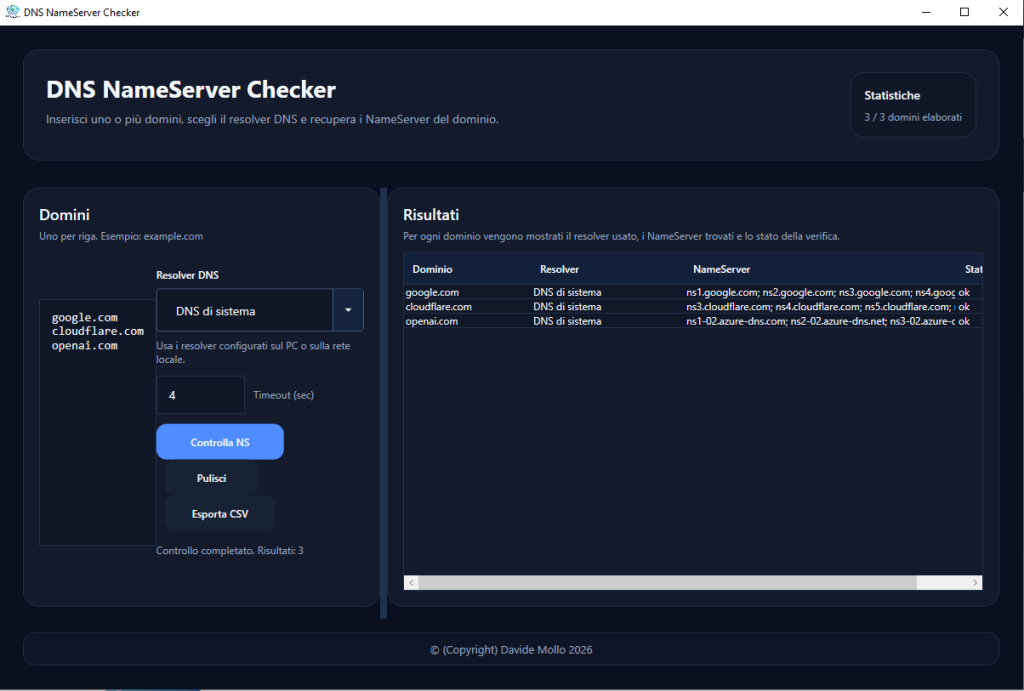 - Risultati: mostra dominio, resolver utilizzato, nameserver trovati e stato dell’operazione.